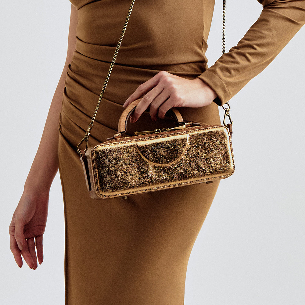 Para a Cápsula Âmbar, a Bolsa Helle Wide ganha um novo aspecto. Dessa vez, a peça é esculpida em um couro metalizado dourado que também traz nuances de bronze combinado aos aviamentos em madeira em tom médio. Sua alça de mão e meia argolas laterais são esculpidas em madeira nos mesmos formatos dos aviamentos da bolsa original . Já os metais, tanto a corrente da alça removível quanto os puxadores, são banhados em ouro velho, para criar um equilíbrio harmonioso entre suas principais matérias-primas. Assim como a versão original, a peça tem shape alongado e quadrado, sendo uma opção versátil para o dia a dia, podendo ser usada à tiracolo ou como bolsa de mão.