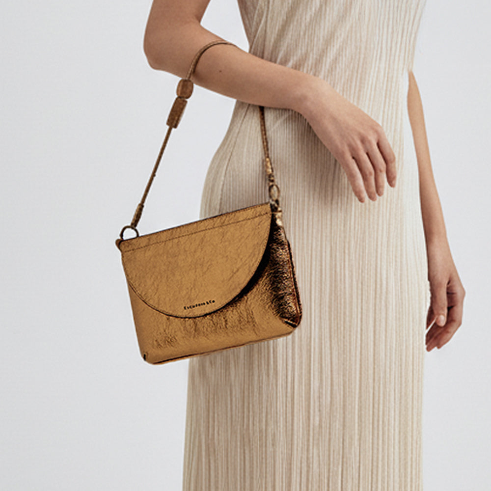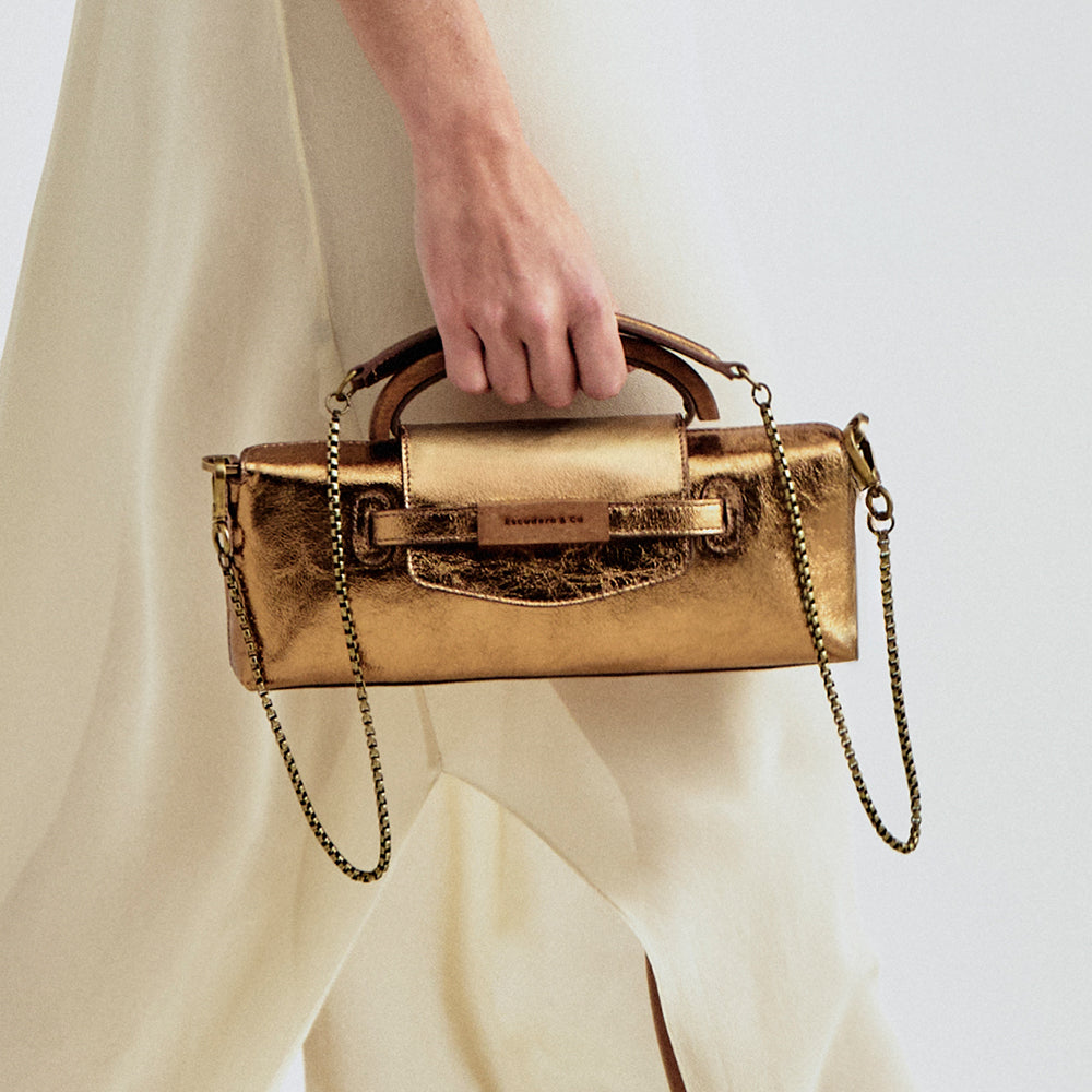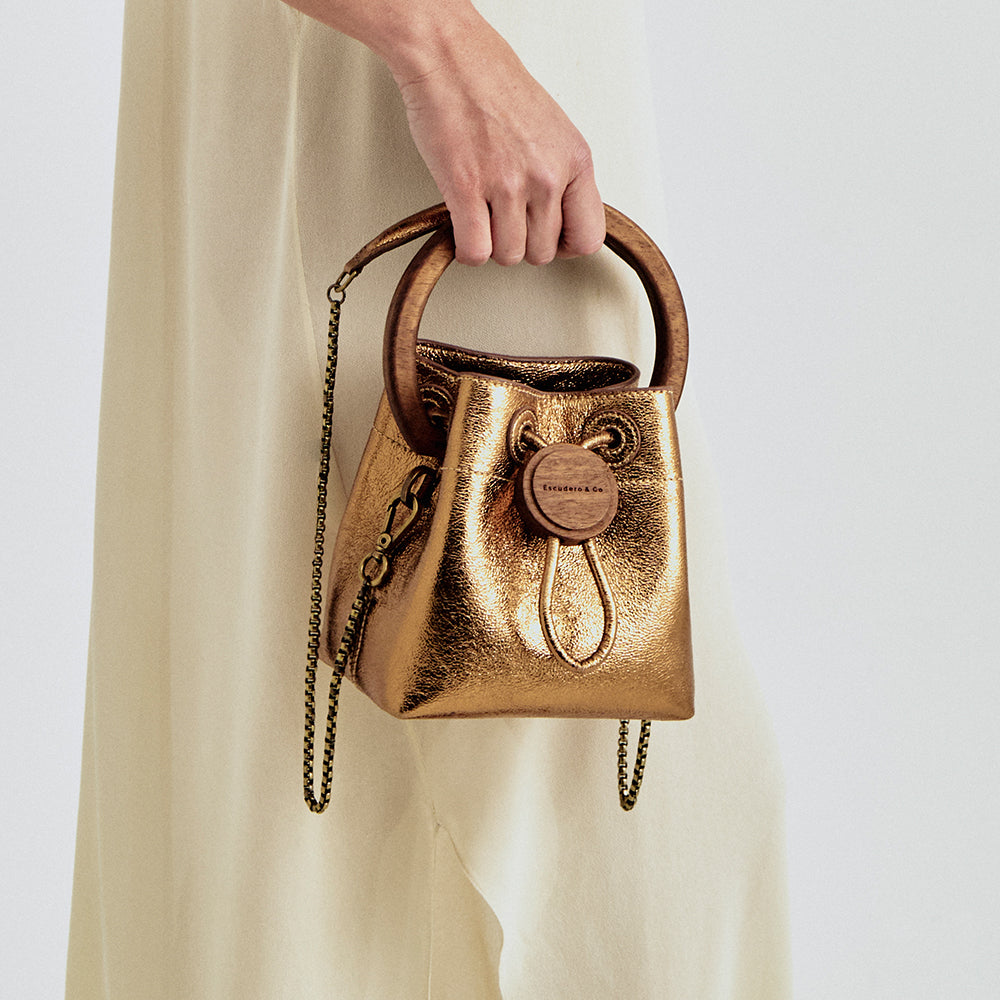 A estética dos anos 70 é o que dita o shape da Bolsa Ange Bucket que, agora, acaba de ganhar uma nova versão. Esculpida em couro metalizado, com tons de dourado e bronze, ela compõe a Cápsula Âmbar, que traz grandes ícones Escudero em outra roupagem. Elegemos uma nova matéria-prima para celebrar os dias de verão e combinamos mais um estilo de aviamento. A peça é feita em couro e recebe a madeira esculpida à mão em tom médio, tanto no fechamento quanto na alça de mão, todas essas escolhas juntas criam uma estética equilibrada e que foge do óbvio. Na alça a tiracolo, banhamos os metais em ouro velho, que cria um contraste sutil juntamente às outras texturas.