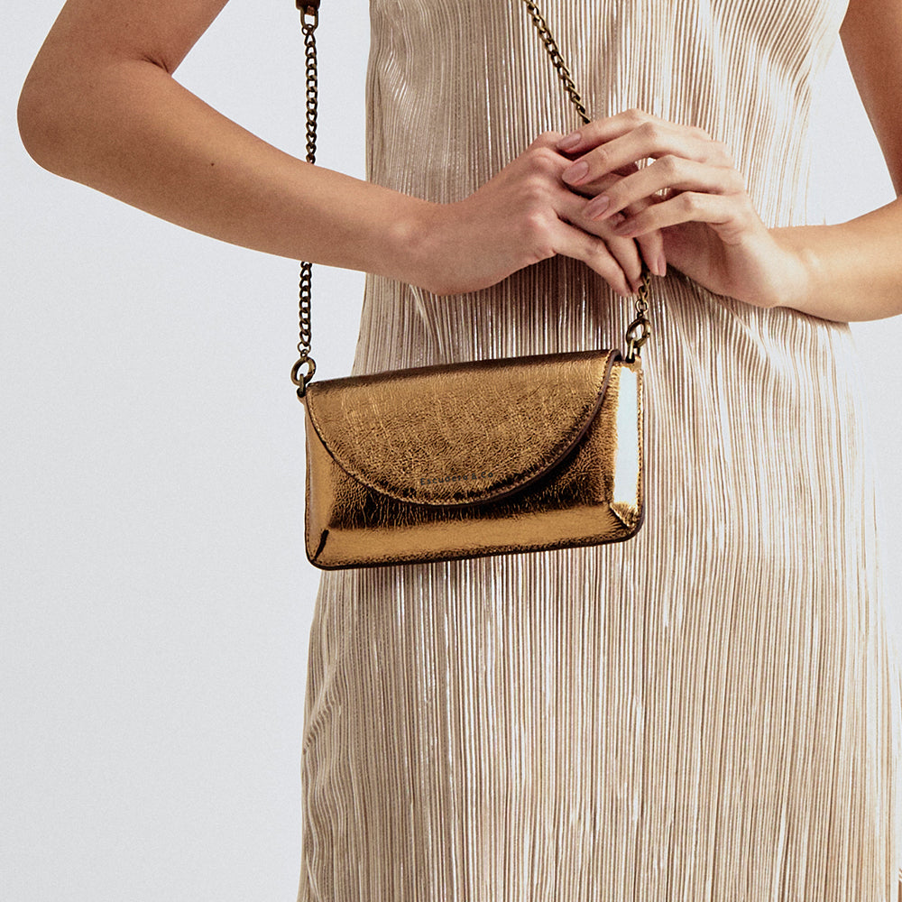 A Bolsa Lille Sascha Wide da Cápsula Âmbar é um modelo para se ter no armário, seus materiais são marcantes e únicos: o couro metalizado em tons de dourado e bronze, os metais em ouro velho e os detalhes de madeira são a combinação mais chic para a sua bolsa de ocasiões especiais. Ela ser usada como clutch ou tiracolo, com alça longa ajustável e removível, e também com a alça de mão em meio círculo estruturado em madeira, que traz um toque artesanal e escultural ao design. O fechamento através do imã localizado na pequena tampa que avança para a frente da bolsa, assim como no topo do modelo, mantém os itens protegidos. Uma peça versátil, leve e com acabamentos que fazem a diferença.