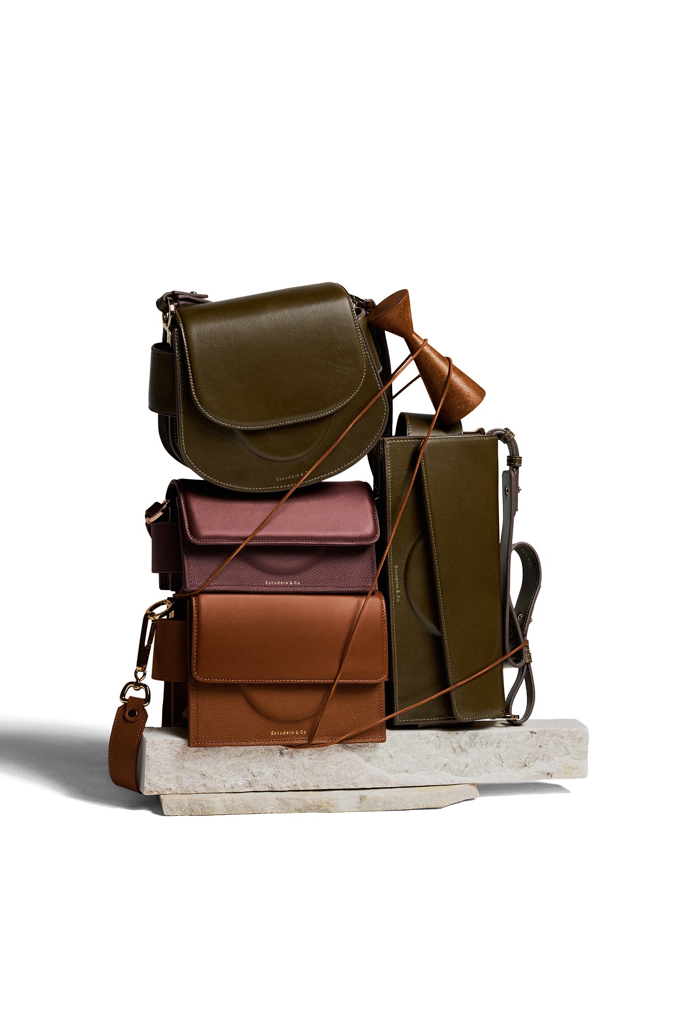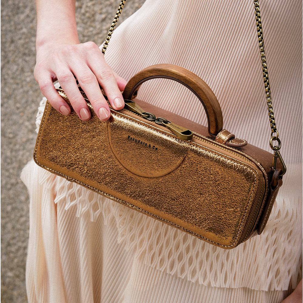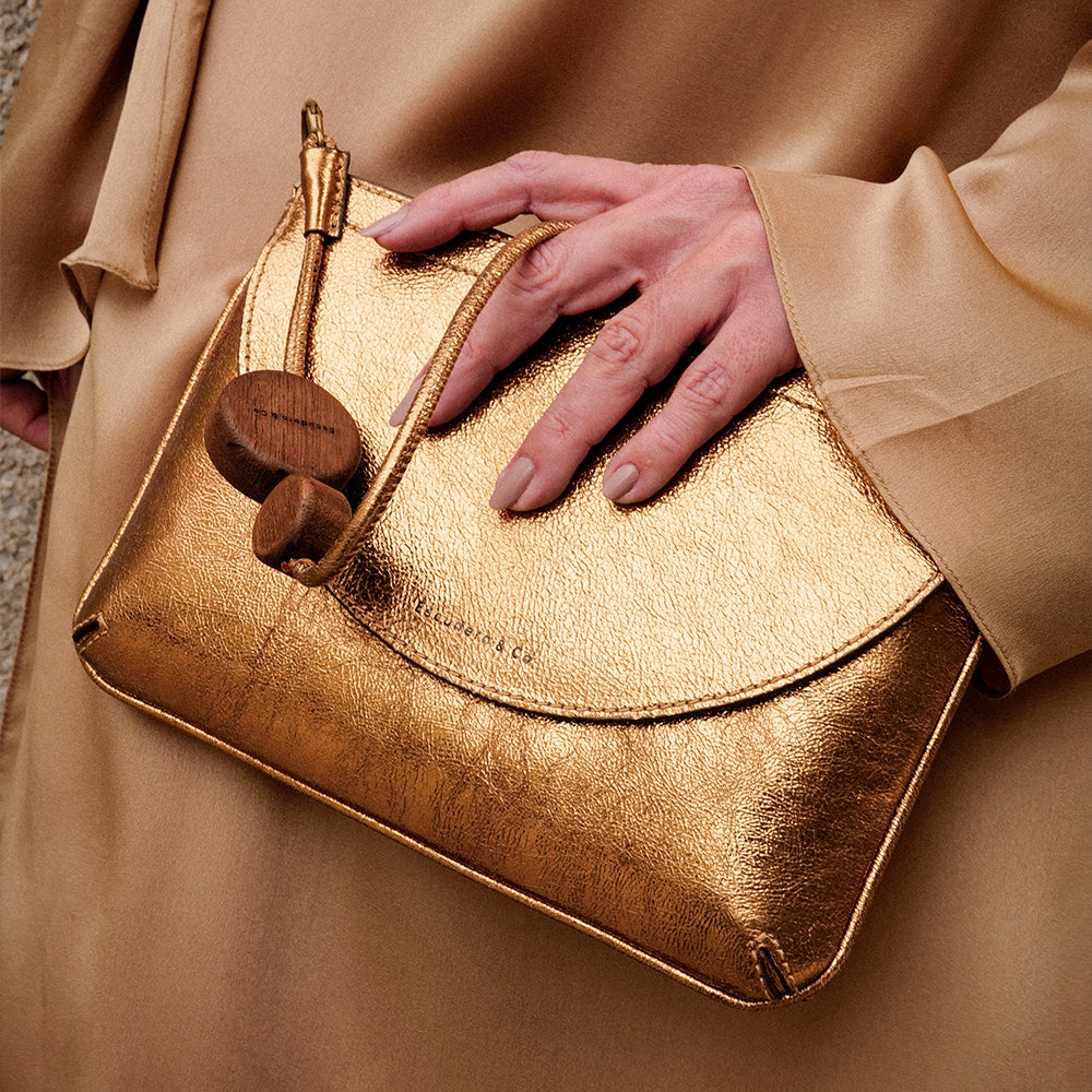 Dentro do nosso universo, cápsulas são famílias que nascem não do shape, mas da matéria. Âmbar reúne peças limitadas criadas a partir de um único ponto de partida. O brilho dourado, o acabamento metálico e a construção de aviamentos em madeira natural estabelecem vínculos entre todas elas. Uma família de tempo definido, mas ancorada em valores permanentes. Um conjunto que traduz luminosidade, precisão e a sobriedade que define a Escudero.